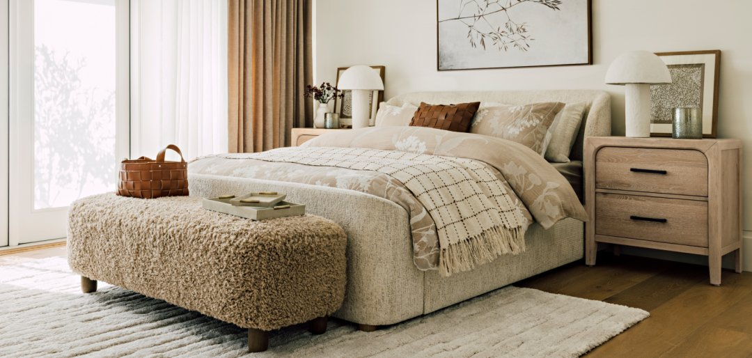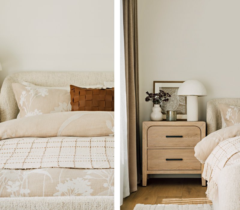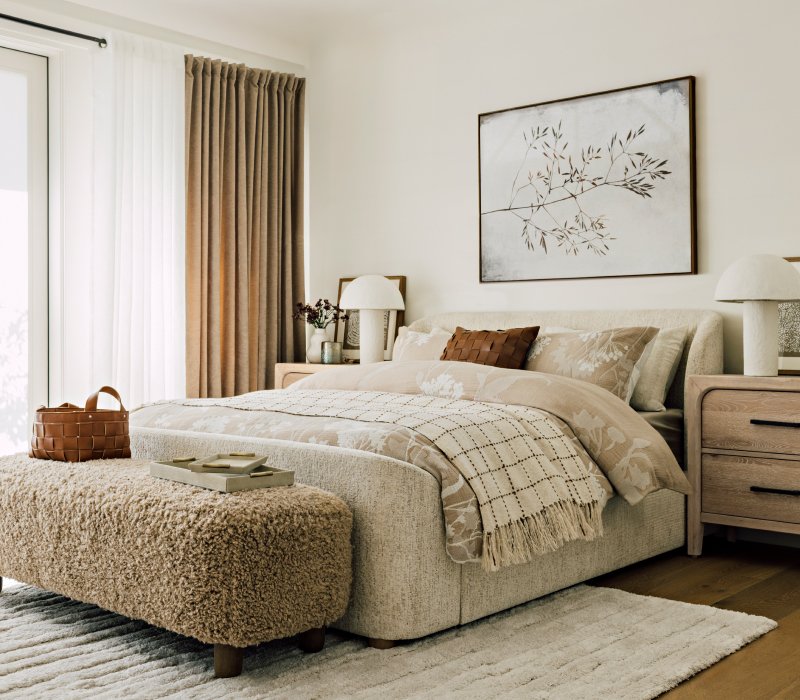 Pulling inspiration from nature, this serene bedroom balances cool brightness with soft warmth. Sheer drapes diffuse light for a luminous glow, while natural wood and a palette of calm earth tones provide just enough grounding contrast. Mushroom lamps, woven faux leather and foliage motifs put the perfect finishing touch on this interior’s fresh and refined aesthetic.
