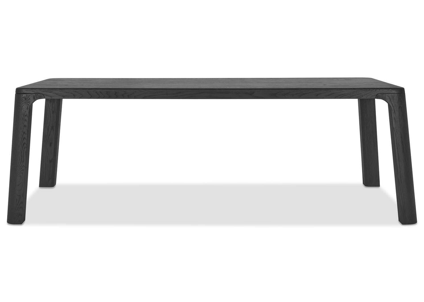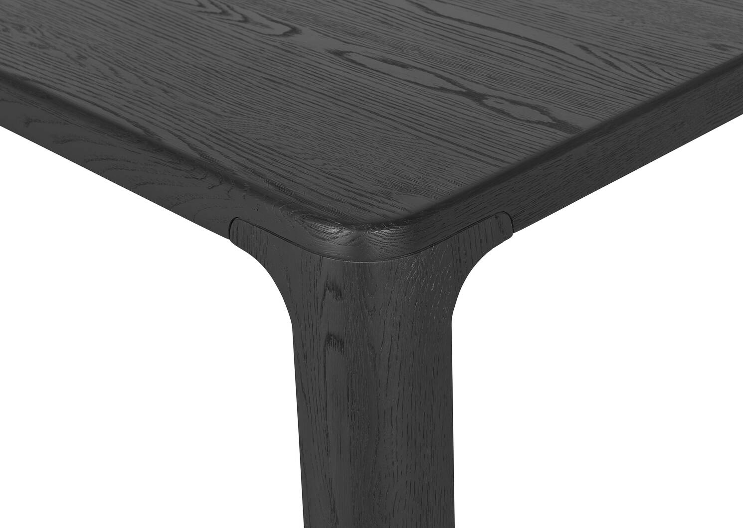 • The table’s finish blends a black stain with a subtle underlying tone of brown to achieve a modern yet warm feel
