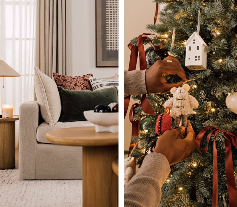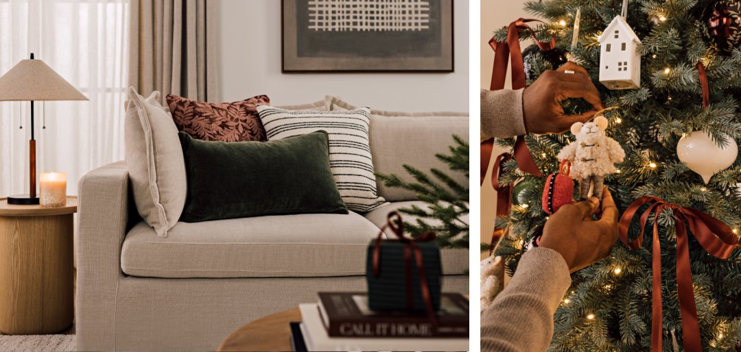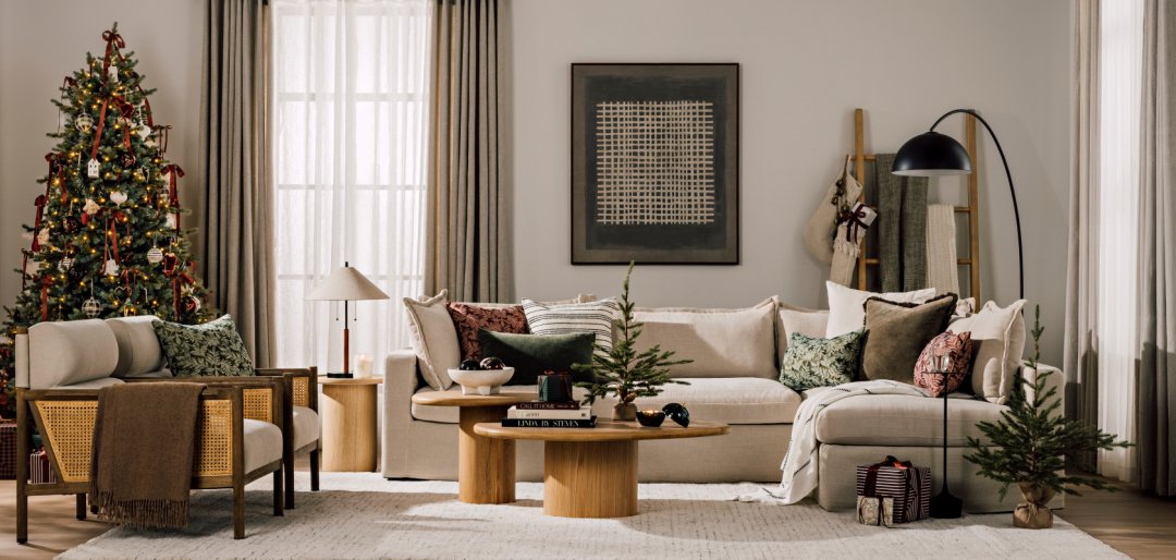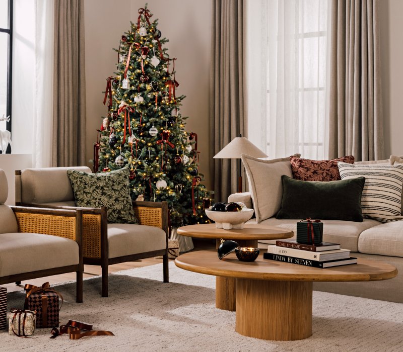 Dehors, il fait froid, mais à la maison, il fait si bon. Découvrez ce décor festif présentant un sapin scintillant, des sièges accueillants et des bas de Noël suspendus avec soin à l’échelle porte-couvertures. Des nuances brillantes, mariées aux couleurs classiques rouge et vert, apportent la touche finale à cette version élégante et moderne d’un temps des Fêtes d’antan.